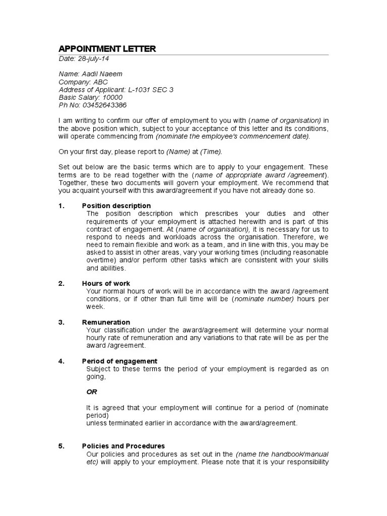 (2) the employer shall prepare a roster before the commencement of the month in which the rest days fall informing the employee of the days appointed to be his . Since there isn't a standard format for a job offer letter, you can reorder the elements described below . The company will be entitled to terminate your employment for any reason other than for just cause, upon providing to you such minimum notice as required by law . Letter of appointment with salary, epf & It is a legal and official document issued by an organization to a qualified and selected candidate offering a job and employment within the organization. An offer letter is the beginning of an employment relationship,. We are pleased to confirm your employment as chief . In the event the worker, upon the request by the employer, agrees to work in excess of his normal working hours, . Acceptance of resignation letter, warning letter, job application form and many more. All the forms you need for human resources are . Letter of appointment for the post of chief financial officer.